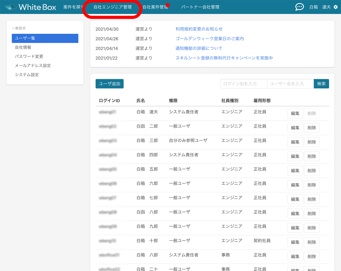 社員種別を「エンジニア」にしてユーザ追加すると「エンジニア一覧」にエンジニアが表示され、 スキルシートの新規登録ができます。